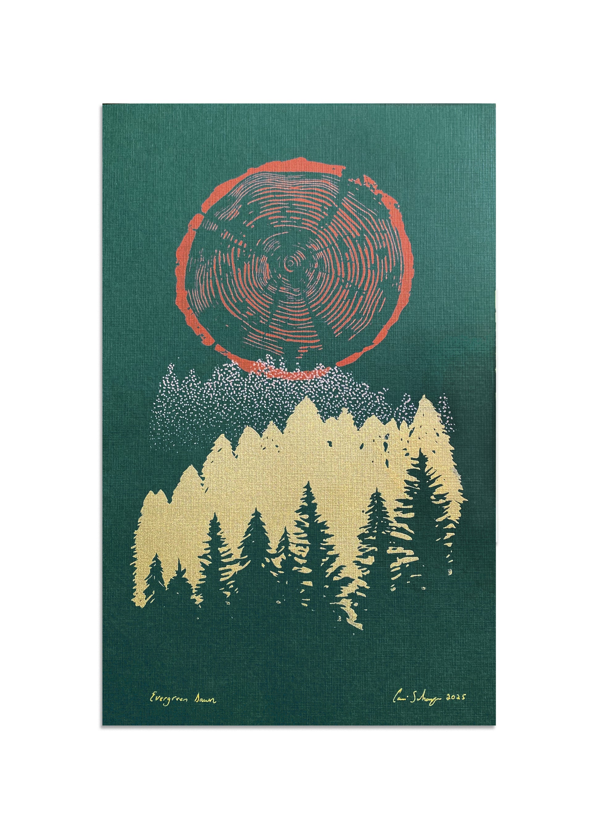 Hand-pulled 3-color screen print. 11” x 17” Printed on 100 lb. Evergreen paper from French Paper Co.